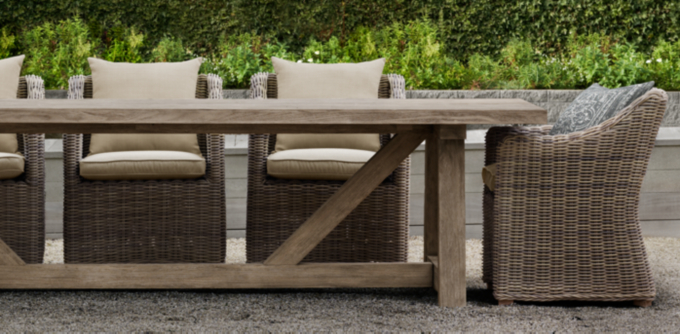 Dining Table: Vintage French Country design, interpreted in premium teak. Designed with a mix of heft and grace, our table's thick teak legs complement the thinner slats that form the top. Handcrafted of premium teak to endure decades of outdoor use. For the Provence bucket chair, see this link: